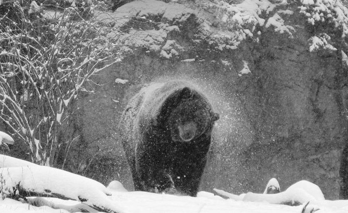 Znalazłem piękne miejsce. Na dość wysokiej skarpie. W dole rozlany szeroko, przegrodzony tamą bobrową strumień. Po drugiej stronie, może sześćdziesiąt metrów dalej, małe otwarcie w gęstwinie. Jakbym był jeleniem to na pewno przychodziłbym się tu napić. Tafla wody tylko trochę zamarznięta. Mróz trwał zbyt krótko by ją solidnie zmrozić. Wróciłem do kabiny po własnych śladach. Wtedy nie było jeszcze tak obecnie dostępnego GPS. Zjadłem lunch. Potem wyszedłem poszukać miejsca na poranną zasiadkę. To wszystko było zgadywanie. Rano jeleń idzie na wzgórze, gdzie jest cieplej, wieczorem schodzi w dół. No, ale trzeba wiedzieć gdzie jest tzw. „beding area”, czyli miejsce ich dziennego odpoczynku. Nie wiedziałem i zgadywałem tylko. Ok. 15:00 wyszedłem na zasiadkę na miejsce przy bobrach. No może raczej na „zastójkę” bo stałem za drzewem przez dwie godziny, prawie do zachodu słońca. Tak długo, jak długo ciągle jeszcze mogłem widzieć muszkę i szczerbinkę. Słońce już było bardzo nisko, chociaż nie było go widać wśród drzew, gdy nagle po drugiej stronie rozlanego strumienia zauważyłem ruch. Posypał się śnieg z pokrytych białymi czapami świerków, zakrakał gawron. Coś nadchodziło. Uniosłem powoli broń do oka… i nagle zobaczyłem. Spod niskich gałęzi świerkowych wysunął się czarny łeb niedźwiedzia. Lekki wietrzyk wiał mi prosto w twarz. Nie mógł mnie zwęszyć. Ukazał się cały. Był wielki. Przednimi łapami rozgarnął śnieg, wyrwał kłodę zmurszałego drzewa, rozrywał ją pazurami co chwila coś wyjadając. Najwyraźniej ten śnieg go zaskoczył, nie zapadł jeszcze w zimowy sen (najczęściej dzieje się to pod koniec listopada) i był głodny.