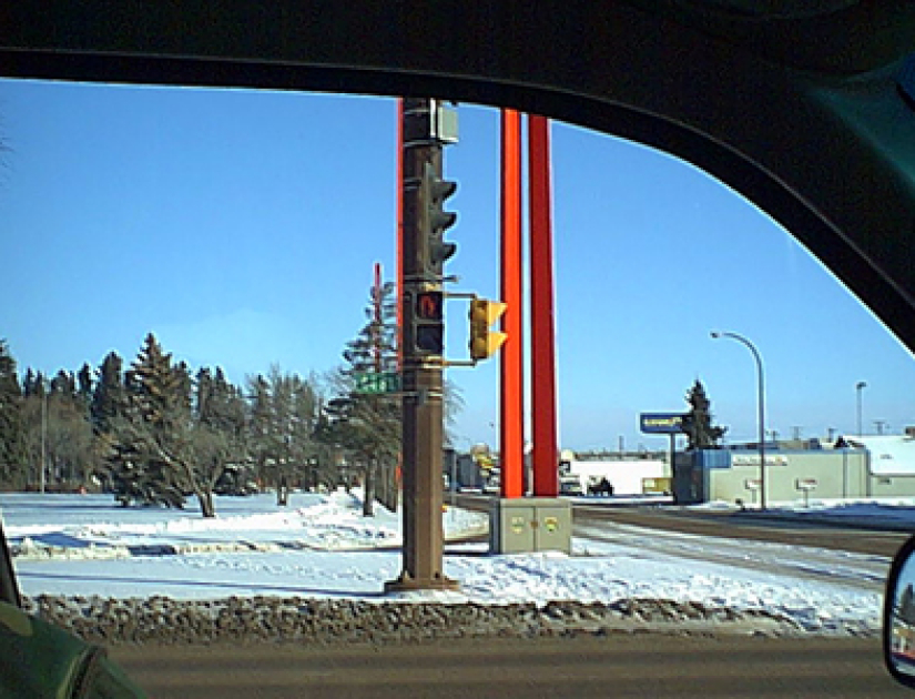 Na tych prostych preriowych drogach szbkości przejazdu są bez porównania większe niż gdzie indziej. Również radar nie ma się gdzie schować. Ani razu nie zobaczyłem radiowozu z radarem na poboczu drogi jak to często się zdarza w Ontario. A jednak prawie wszyscy jeżdżą zgodnie z przepisami. Dużo później dowiedziałem się, że w Albercie i Sakatchewan jest specjalne prawo, które pozwala każdemu notować szybkość innych i meldować na policję przekroczenia szybkości. No cóż miałem szczęście, żaden mandat nie przyszedł. O godz. 20:00 kończymy sprawdzanie systemu w Neilburg. Wszystko działa, wracamy do Lloydminster. Znowu trochę kłopotu z wyjechaniem z Neilburg. Jak na tym filmie gdzie bohaterzy nie mogli wydostać sie z miasteczka, bo każda droga wiodła ich z powrotem. O 21:00 jesteśmy znowu w Lloydminster gdzie zostajemy na noc. Kręcimy się wokół tego miasta, ale to konieczność. Lloydminster to ciekawe miasto. Znajduje się na granicy Saskatchewan i Alberty. Dokładnie na granicy. Przechodzi ona wzdłóż głównej ulicy miasta. Ale to nie wszystko. Ta granica to również granica zmiany strefy czasu. Uwierzycie lub nie, ale po jednej stronie ulicy jest teraz 21:00 a po drugiej już 22:00. Trzeba tu chyba dobrze uważać umawiając się np. na randkę. Ale to jeszcze nie wszystko. Saskatchewan nie zmienia czasu na letni, więc pod koniec marca ta różnica czasu wynosi dwie godziny. W hotelu gdzie mieszkamy to już Alberta czyli godz. 21:30, ale telewizja kablowa jest ze wschodniej strony miasta, więc wszystkie programy są o 1 godz. opóźnione. Granicę prowincji i strefy czasowej zaznaczają wysokie pomarańczowe podwójne słupy. Idziemy spać . Jutro prawdopodobnie nastąpi zakończenie całej instalacji.