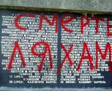 Na zdjęciu: Zdewastowana tablica poświęconapamięci polskich profesorów Uniwersytetu Lwowskiego zamordowanych przez hitlerowcow w lipcu 1940 roku. Napis "Smiert' Liacham" pojawił