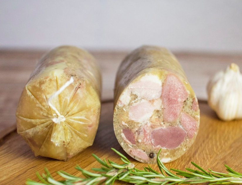 • Biały „Salceson” przyrządzany z mieszanki sezonowanych mięs, bez krwi