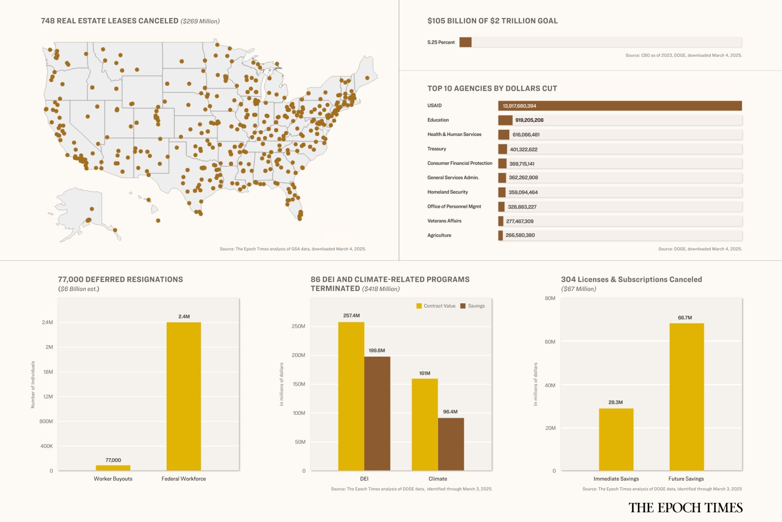 Departament Efektywności Rządowej (DOGE), kierowany przez przedsiębiorcę Elona Muska, poinformował o 105 miliardach dolarów cięć wydatków w ciągu pierwszych sześciu tygodni administracji Trumpa.