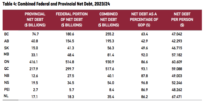 Analitycy oczekują, że największy wzrost tego wskaźnika w punktach procentowych nastąpi w Albercie, która według prognoz ma wzrosnąć z -13,4% do 9,0%, co oznacza wzrost o 22,4 punktu procentowego. Przewiduje się, że Manitoba odnotuje drugi co do wielkości wzrost wskaźnika w punktach procentowych – o 16,1 punktu. Nowa Fundlandia i Labrador ma najwyższy stosunek długu do PKB wśród prowincji wynoszący 41,6%. Quebec zajmuje drugie miejsce ze stosunkiem długu do PKB na poziomie 39,2%, a tuż za nim plasuje się Ontario z wynikiem 38,7%. Quebec jest jednak jedną z zaledwie trzech prowincji, która od roku 2007/08 zmniejszyła swoje zadłużenie w stosunku do gospodarki. Inne prowincje, które chcą zmniejszyć swoje zadłużenie w stosunku do gospodarki, to Nowa Szkocja i Wyspa Księcia Edwarda. Alternatywnym sposobem oceny długu publicznego jest zmierzenie go na osobę. Dług na osobę jest ważny, ponieważ pokazuje, ile długu publicznego średnio każdy obywatel Kanady jest odpowiedzialny za spłatę. Tabela 3 przedstawia szacowany dług federalny i prowincjonalny na osobę (w dolarach 2023) w latach 2007/08 i 2023/24.