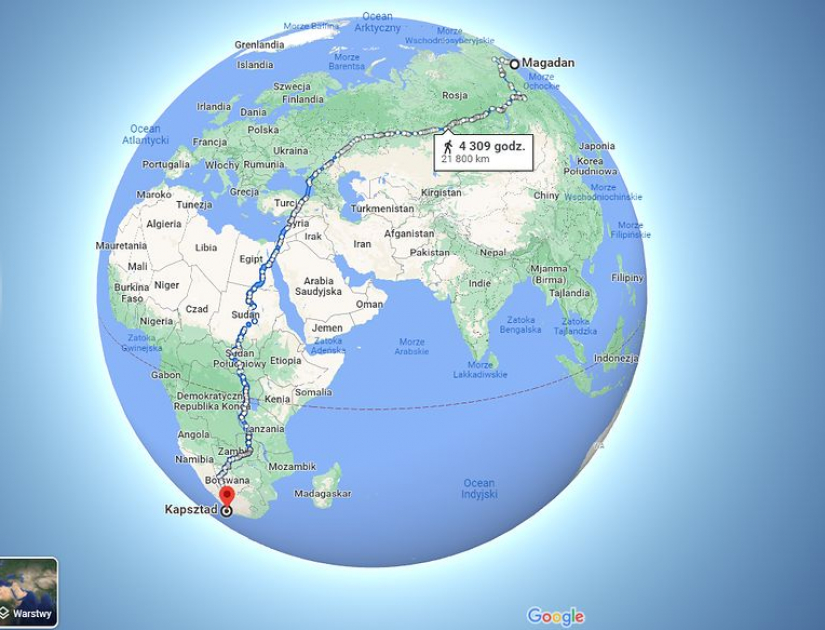 Piesza trasa z Kapsztadu do Magadanu wynosi dokładnie 21800 km.