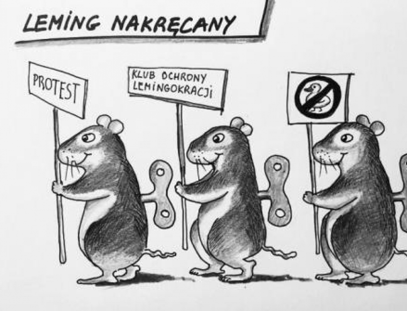 Zjawisko lemingozy tłumaczy fakt, że większość ludzi pragnie uczestniczyć w ważnych wydarzeniach historycznych i to po właściwej stronie, a przede wszystkim być en vogue i comme il faut czyli modnym oraz jak należy, jak trzeba. Te francuskie, dość staroświeckie zwroty najlepiej oddają absurdalność łączenia wartości z modą. Moda jest absurdalna z definicji. Z dziurami na kolanach wytartych spodni możesz obecnie być całkowicie comme il faut na koncercie w filharmonii. We Francji po naszym stanie wojennym było en vogue opiekowanie się jakimś polskim emigrantem i wielu rodaków sporo na tym skorzystało. Ludzie dla których wybory moralne i polityczne podlegają wymogom mody mogą oczywiście mimochcąc zrobić dużo dobrego, na przykład pomagając ofiarom wojny, chorym dzieciom w Afryce, bezdomnym psom, czy polskim emigrantom. Skłonność ludzi do ulegania modzie nie tylko w sprawach błahych lecz również najistotniejszych może być jednak używana do wyprowadzania społeczeństwa w pole i do realizacji szkodliwych dla tego społeczeństwa tajnych planów. Na przykład gdyby nie zbiorowa bezkrytyczna fascynacja Wałęsą i osiągnięciami okrągłego stołu architektom transformacji ustrojowej nie udałoby się tak łatwo nas obrabować i wpędzić w ślepa uliczkę.