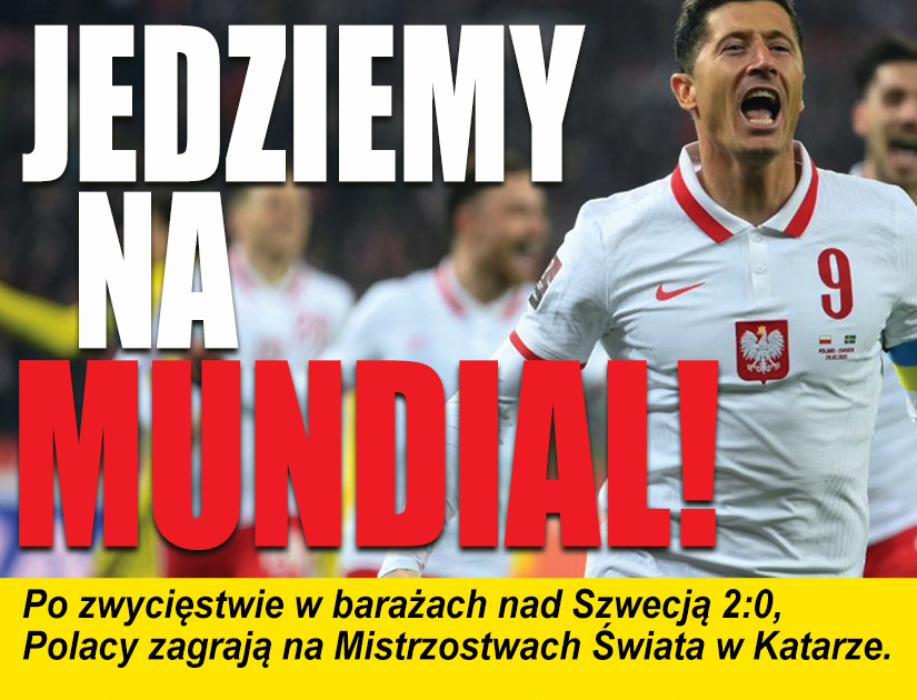 Piłkarska reprezentacja Polski zagra na mistrzostwach świata w Katarze. W finale baraży biało-czerwoni pokonali na Stadionie Śląskim w Chorzowie narodową drużynę Szwecji 2:0. Gole dla ekipy Czesława Michniewicza strzelili Robert Lewandowski i Piotr Zieliński.