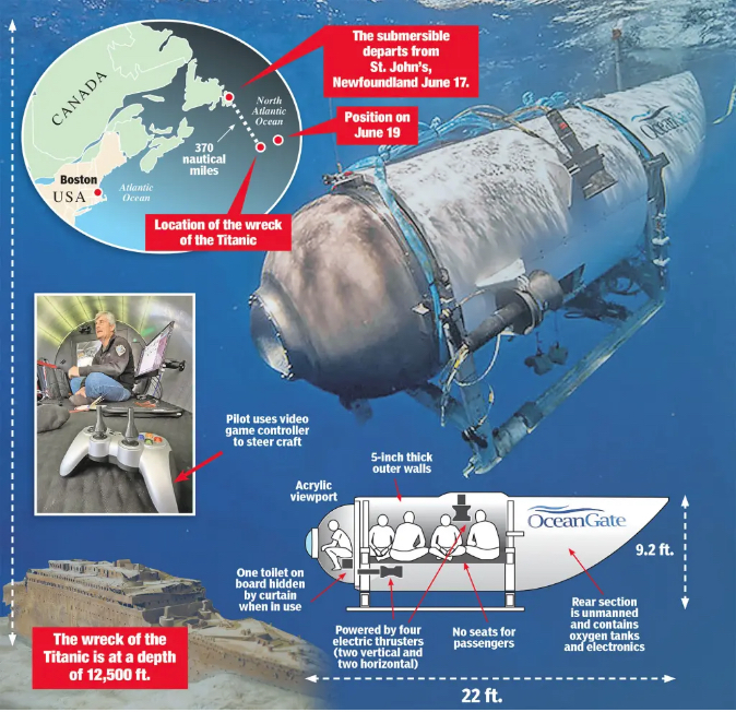 Zgłoszono, że łódź podwodna zaginęła o- koło 370 mil morskich – czyli 685 kilometrów – od wybrzeży Nowej Funlandii podczas misji nurkowej do legendarnego wraku.