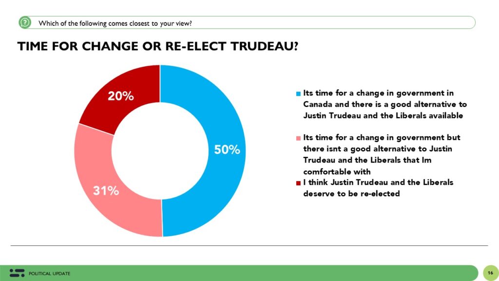 Sondaż ten wykazał, że gdyby wybory odbyły się dzisiaj, 38% Kanadyjczyków oddałoby głos na Partię Konserwatywną, a tylko 26% na Liberałów. To najniższe poparcie dla Liberałów od czasu, gdy Trudeau został premierem w 2015 roku.