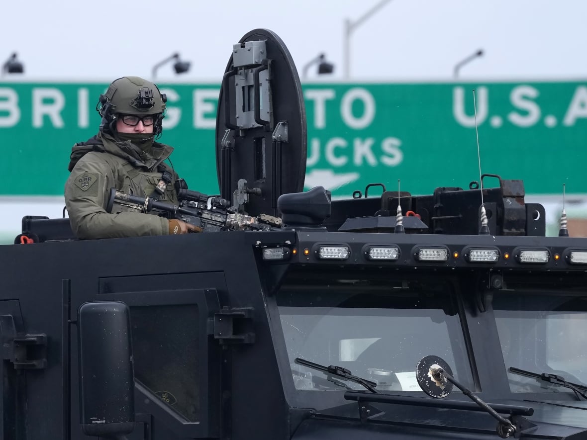 Policjanci w siłach policji municypalnej z Windsor i London, Ontario Provincial Police i sił taktycznych RCMP ruszyli ławą w asyście pojazdów policyjnych w tym także opancerzonych pojazdów taktycznych, spychając demonstrantów wspierających kierowców z wjazdu na przedmoście.