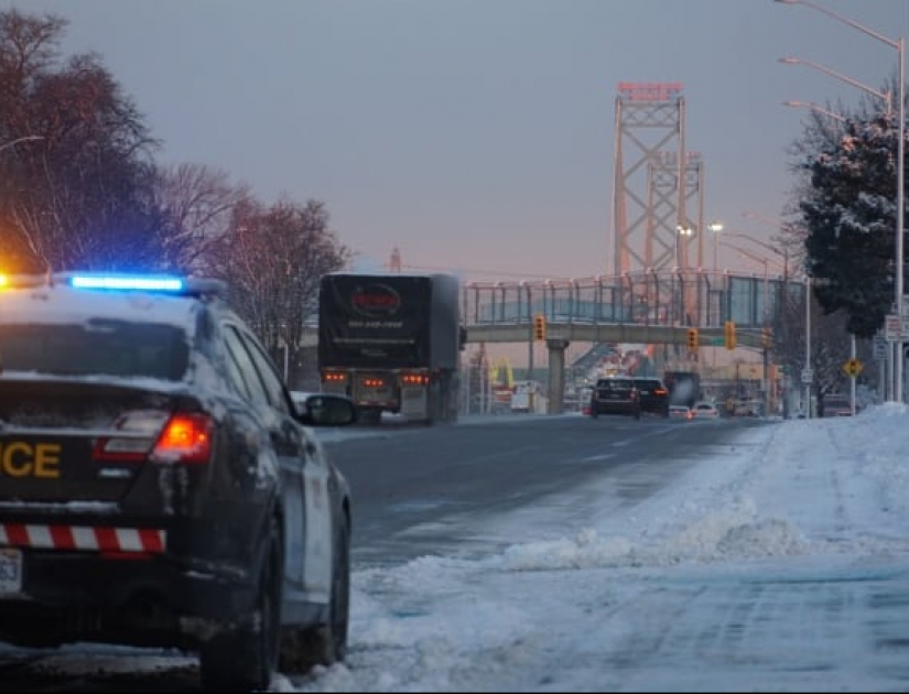 Policjanci w siłach policji municypalnej z Windsor i London, Ontario Provincial Police i sił taktycznych RCMP ruszyli ławą w asyście pojazdów policyjnych w tym także opancerzonych pojazdów taktycznych, spychając demonstrantów wspierających kierowców z wjazdu na przedmoście.