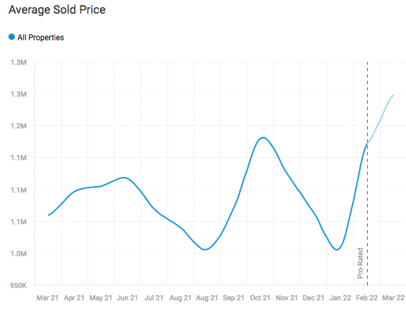 Przewiduje, że średnia krajowa cena domu wzrośnie o 14,3 procent rocznie do 786 000 dolarów w 2022 roku, a następnie o kolejne 3,2 procent do 810 934 dolarów w 2023 roku.