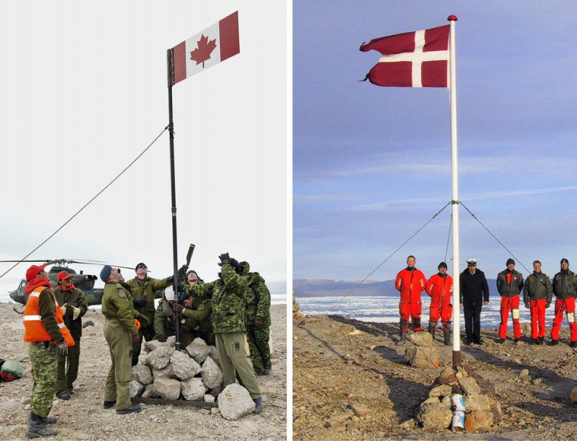 Dotąd patrole wojskowe obu krajów podczas inspekcji spornego terytorium pozostawiły dla kontrpartnerów butelki alkoholu jako dowód swoich roszczeń do ziemi, Kanadyjczycy pozostawili butelki Canadian Club a Duńczycy pozostawiali butelki sznapsa.