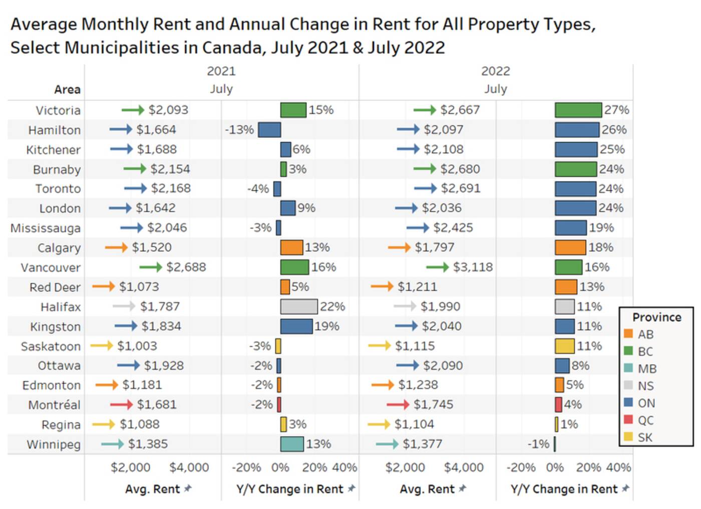 Tendencja ta jest jednak znacznie wyraźniejsza w regionach takich jak Toronto, gdzie średni czynsz za wszystkie rodzaje nieruchomości wzrósł o oszałamiające 24 procent między lipcem 2021 a 2022 r., osiągając 2 691 dolarów.