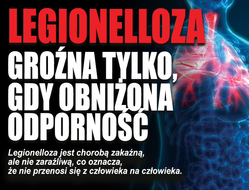 Legionelloza jest chorobą zakaźną, ale nie zaraźliwą, co oznacza, że nie przenosi się z człowieka na człowieka. Nie każda osoba narażona na te bakterie zachoruje, w grupie ryzyka są osoby z obniżoną odpornością, palące, przewlekle chore i w starszym wieku.
