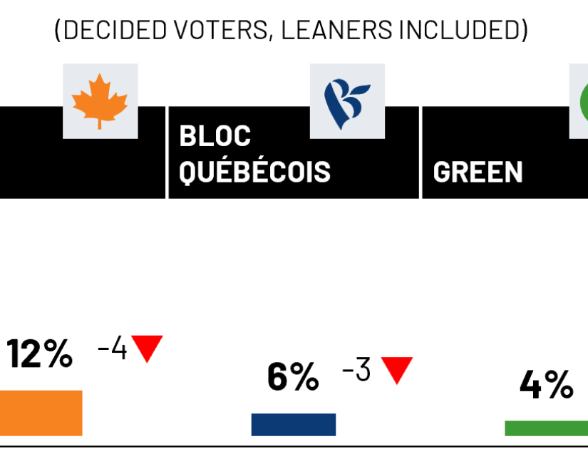 Sondaż Ipsos pokazuje, że liberałowie wyprzedzają konserwatystów wśród zdecydowanych wyborców — chociaż dwupunktowa różnica mieści się w 3,8-procentowym marginesie błędu.