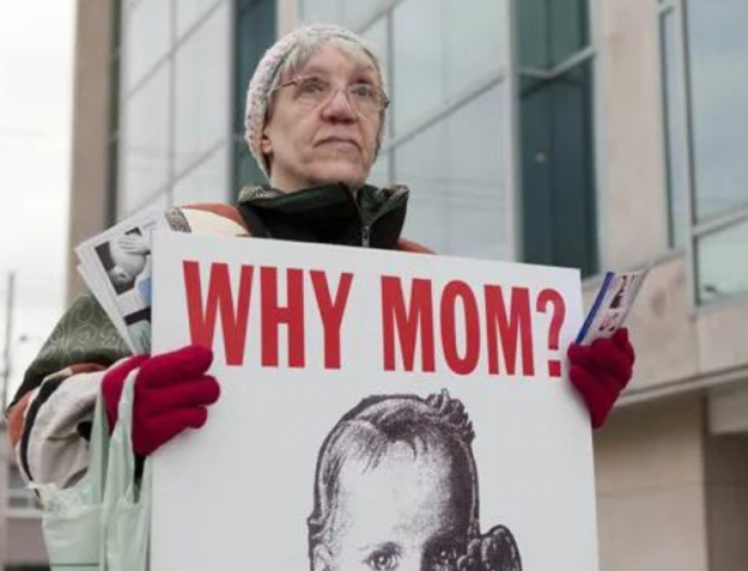 77-letnia Linda Gibbons stała przed kliniką ze znakiem przedstawiającym płaczące dziecko z podpisem „Dlaczego mamo? Kiedy mam tyle miłości do dania”.